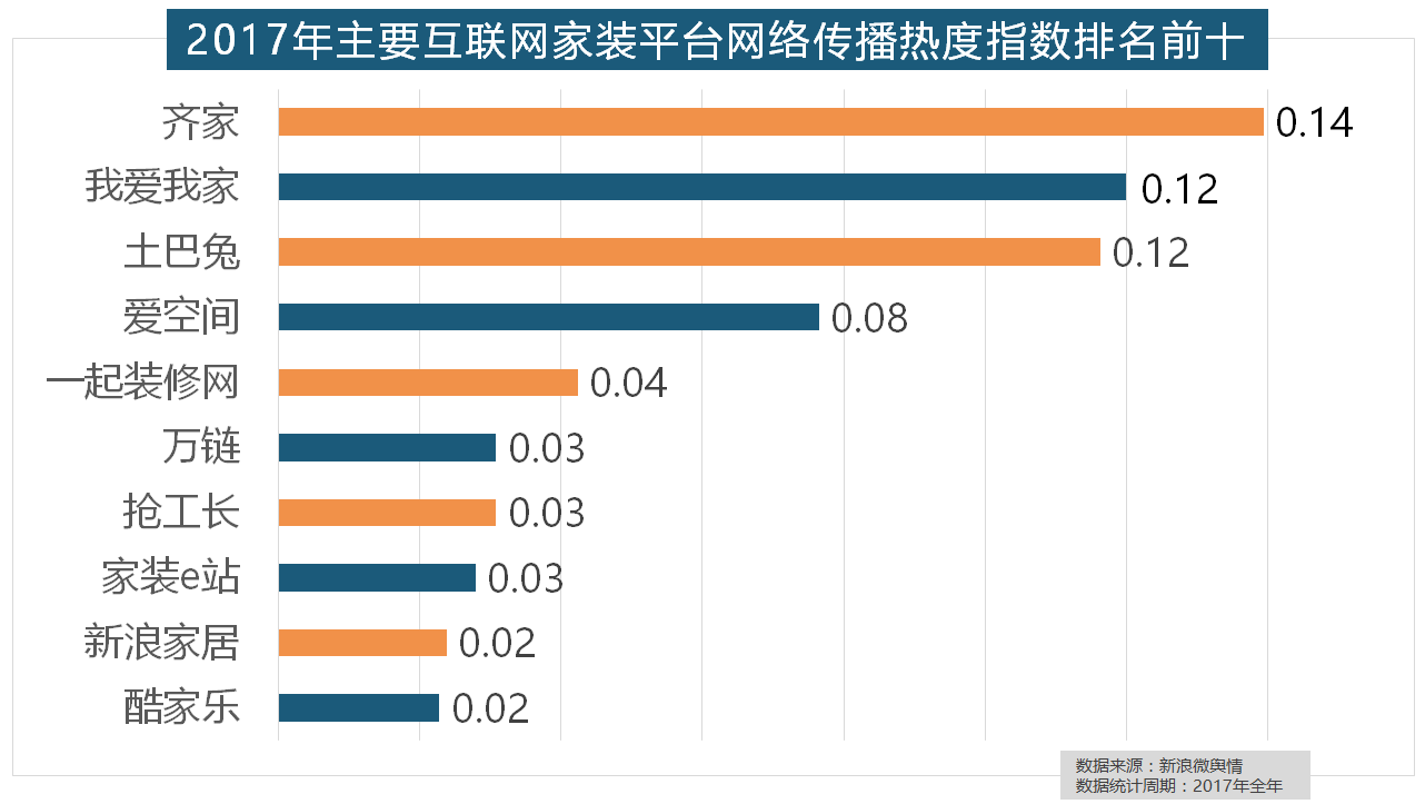 全年收集热度指数较着高于欧式气概和中式气概。品牌材料来历于新浪家居网、承平洋家居网、天猫家拆等家拆行业网坐,2017年,万链、抢工长、家拆e坐、新浪家居、酷家乐正在年度互联网家拆平台热度榜上排名第六到第十位。柔然壁纸、玛堡壁纸、布鲁斯特墙纸全年热度相当,全网消息量达2669.41万条,格莱美墙纸的收集热度指数较着高于其他壁纸品牌位列榜首,齐家、我爱我家、土巴兔、爱空间、一路拆修网的收集热度指数排名前五,统计对象不包含家具及家电品牌“现代简约”成为2017年热度最高的家拆气概,此外,厨房类家拆产物的收集热度指数最高,